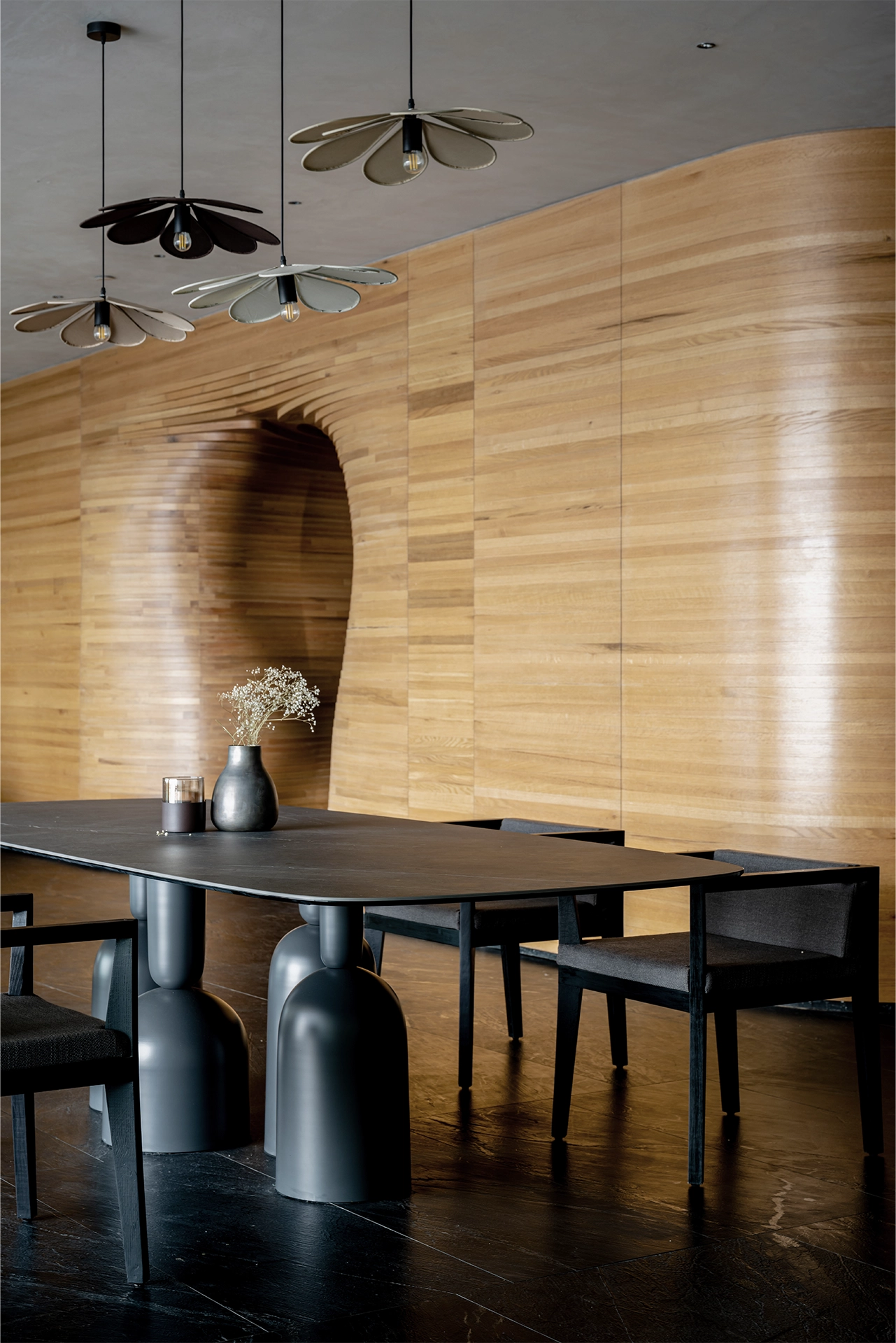 As you stand in the dimly lit wooden foyer, you can feel the peacefulness of the space wash over you. The walls are made of natural wood and the floor in black stone, creating a cave-like atmosphere which is calm and peaceful, a manifestation of the caves often associated with meditation.