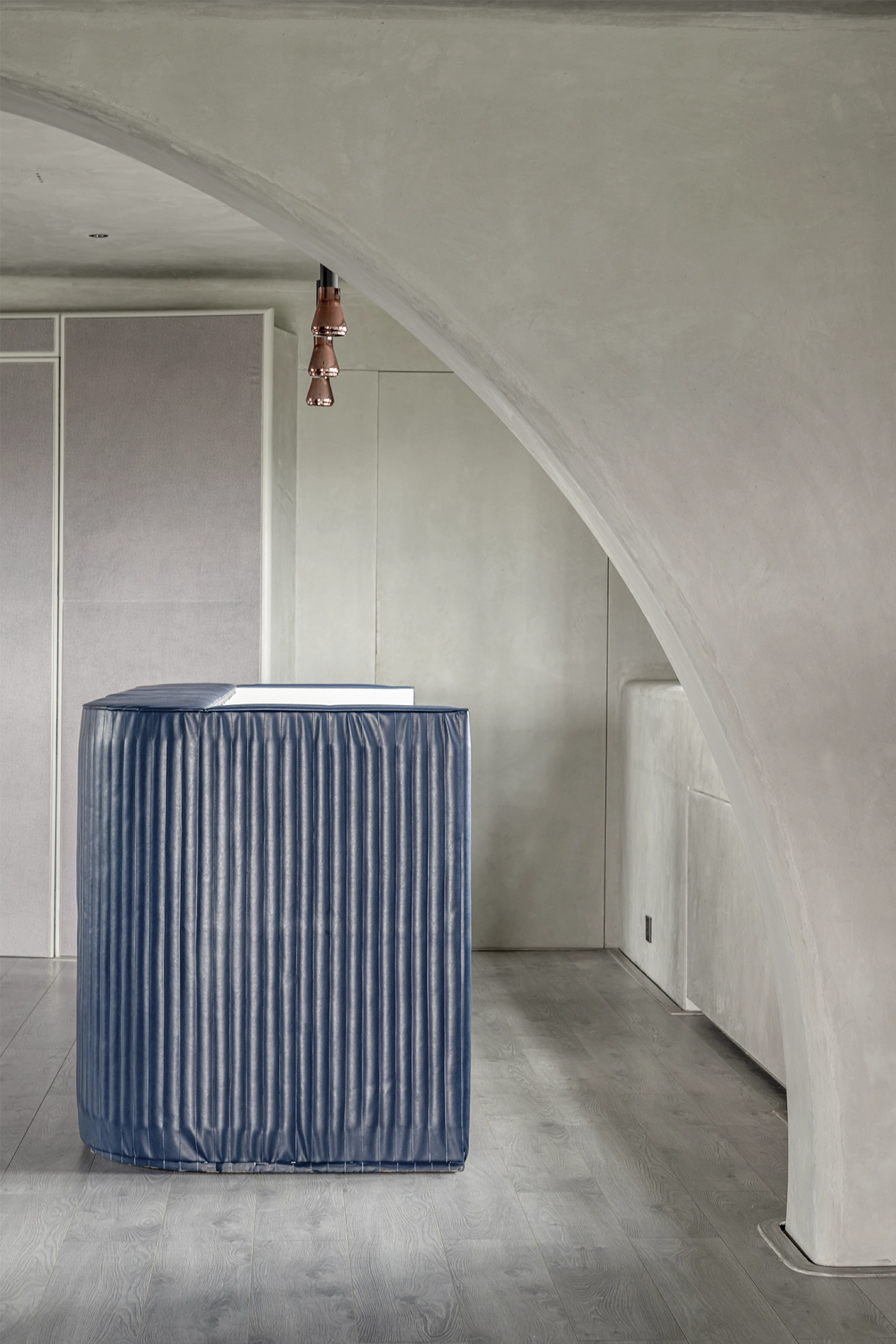 The studio unlocks into an arrival-cum-waiting area with a reception desk- crafted with a decorative fluted blue leather finish. This space is conceived as a beano and installed with a club music audio set-up. The system is concealed in the curved wall finished with a fabric skin. It also conceals the lift doors. Two monumental arches across the hallway merge into the walls, segregating this 2000 sq.ft. studio, further into a sequence of spaces, each designed to accommodate a different experience of sound.